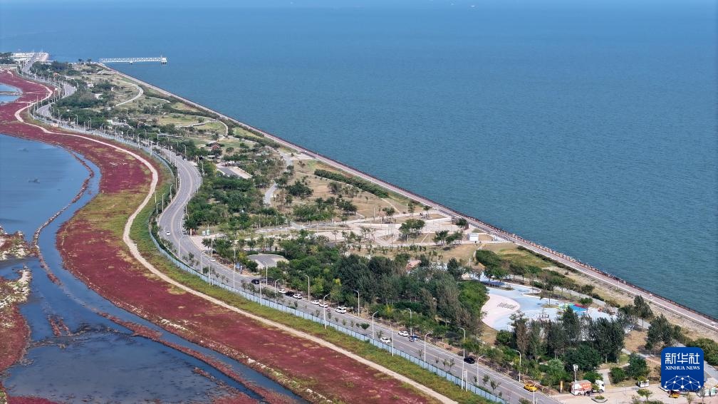 9月27日,游人在中新天津生态城东堤公园观海(无人机照片)。