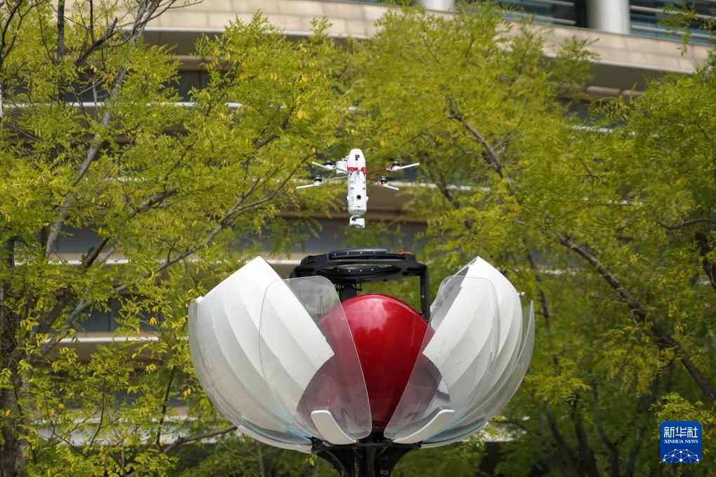 9月27日,在中新天津生态城,一架无人机起飞准备例行巡检。