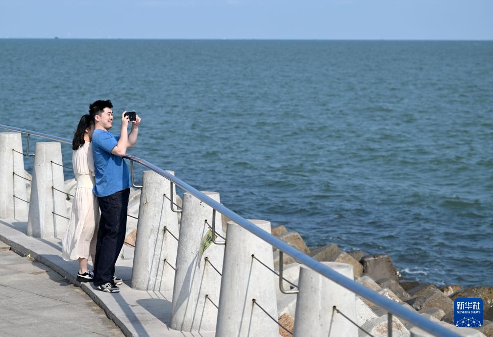 9月27日,市民游客在中新天津生态城东堤公园欣赏海景。