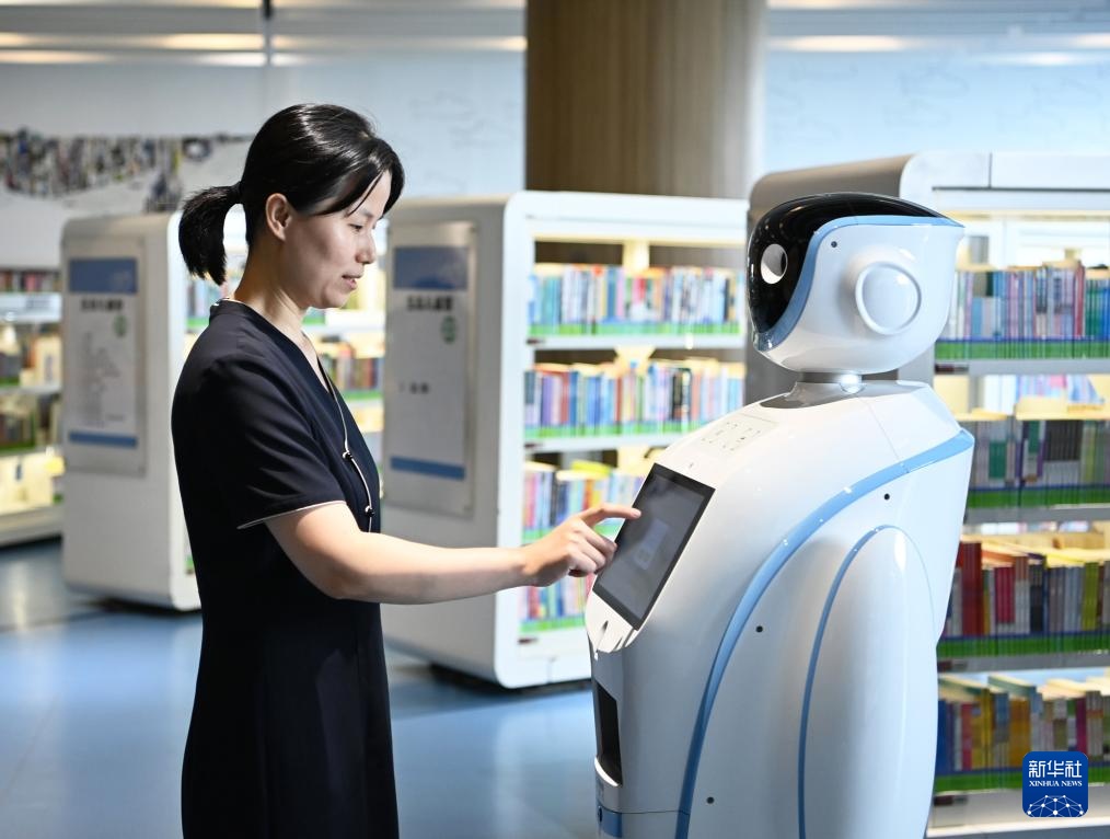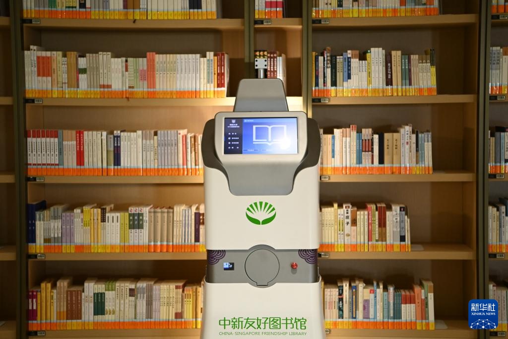 9月27日,一款智能盘点机器人在中新天津生态城中新友好图书馆内工作。