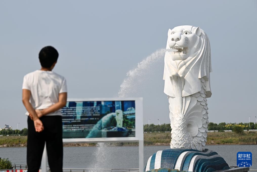 9月27日,市民在中新天津生态城中新友好公园内查看由中新天津生态城管委会与新加坡旅游局协定后建设的鱼尾狮雕塑的介绍。