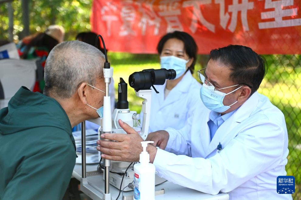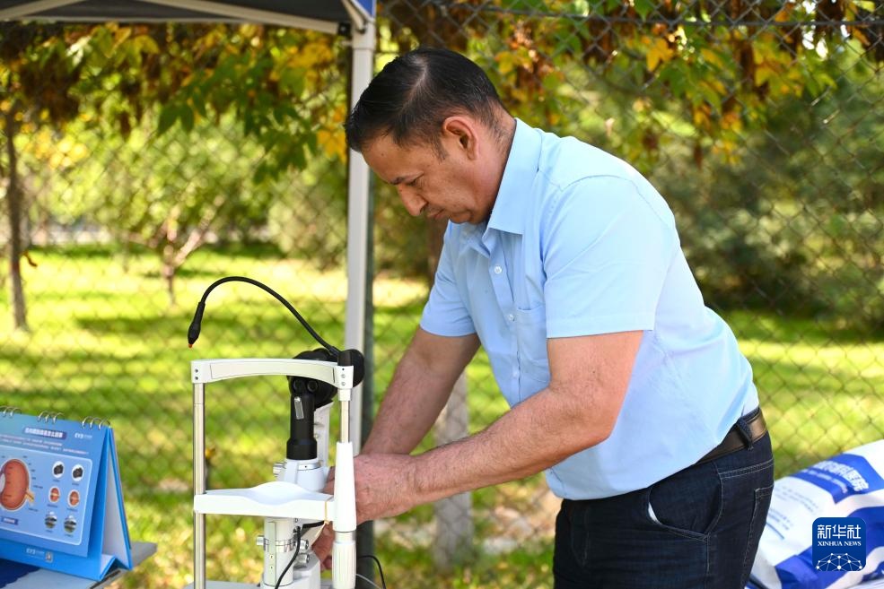 9月26日,伊西德罗(右一)在宁夏银川市景湖社区开展眼科义诊时调整仪器。