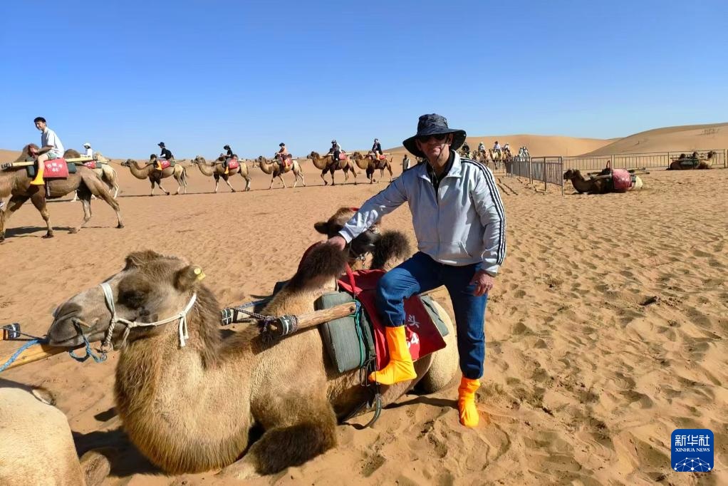 8月20日,伊西德罗在宁夏中卫市沙坡头旅游景区体验骑骆驼。