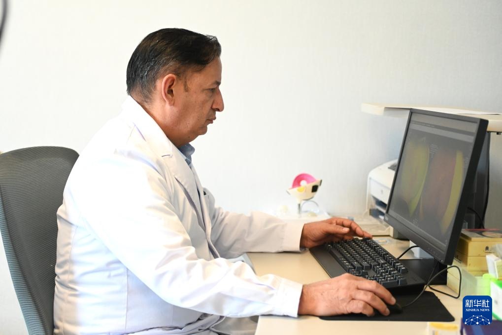 9月26日,在宁夏银川市爱尔眼科医院的诊室内,伊西德罗查看患者的眼底照片。
