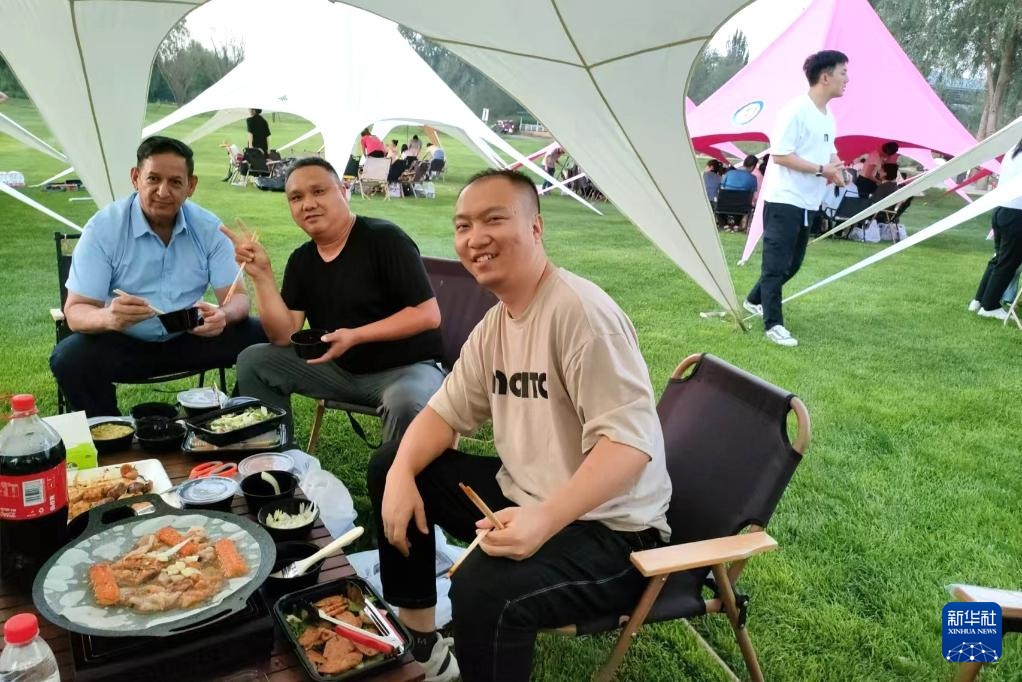 8月16日,伊西德罗(左一)在宁夏银川市一公园内与同事们团建。