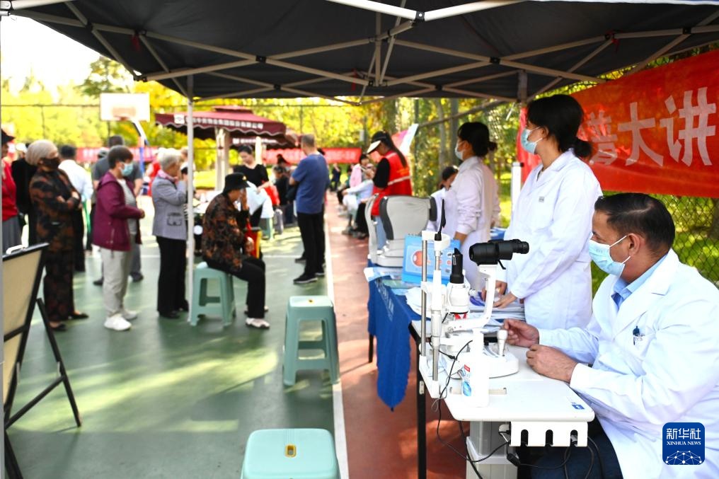 9月26日,伊西德罗(左一)在宁夏银川市艺校社区开展眼科义诊时询问居民的身体情况。