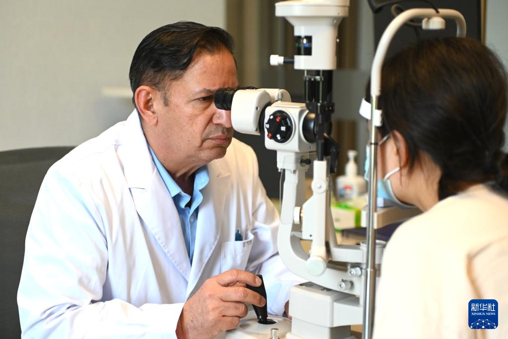 9月26日,在宁夏银川市爱尔眼科医院的诊室内,伊西德罗为患者进行眼部检查。
