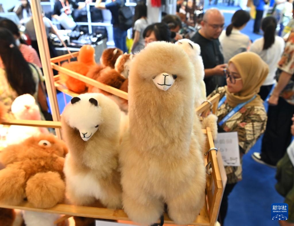 9月28日,观众在中国—东盟博览会上挑选秘鲁羊驼毛公仔。