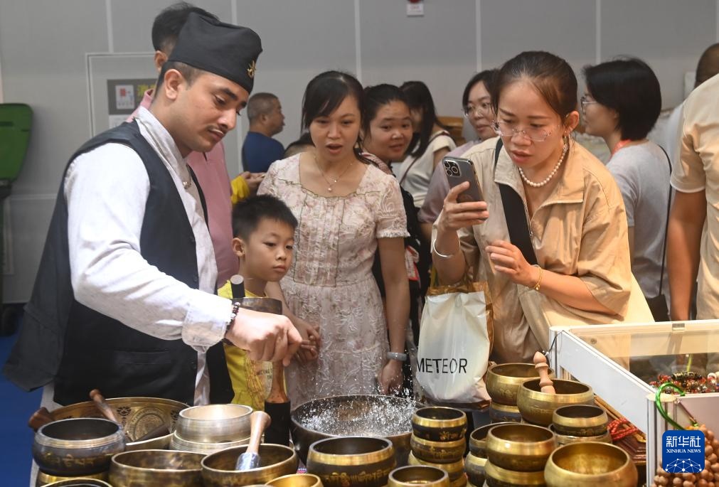 9月28日,在广西南宁国际会展中心,工作人员(左一)推介来自尼泊尔的商品。