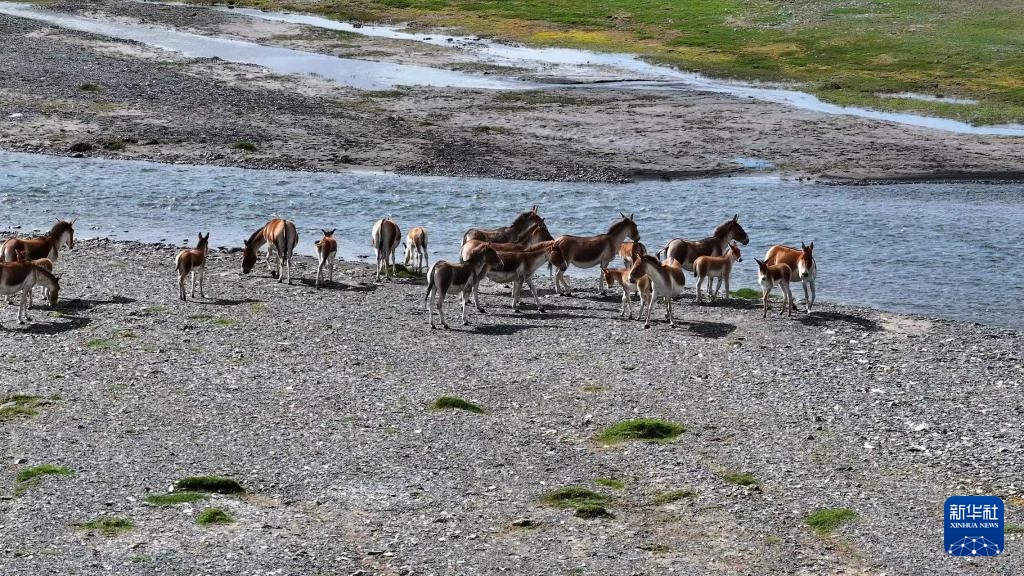 这是8月9日在位于三江源国家公园长江源园区的曲麻莱县境内拍摄的藏野驴(无人机照片)。