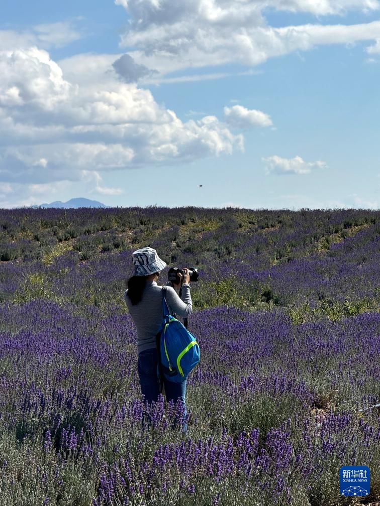 9月28日,在天山花海国家现代农业产业园区,游客在薰衣草花田里拍照。