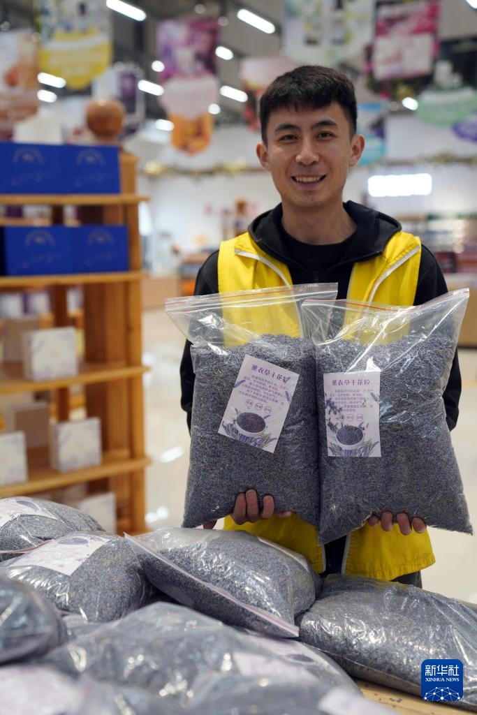 9月28日,在天山花海国家现代农业产业园区服务中心,工作人员推介薰衣草干花粒。