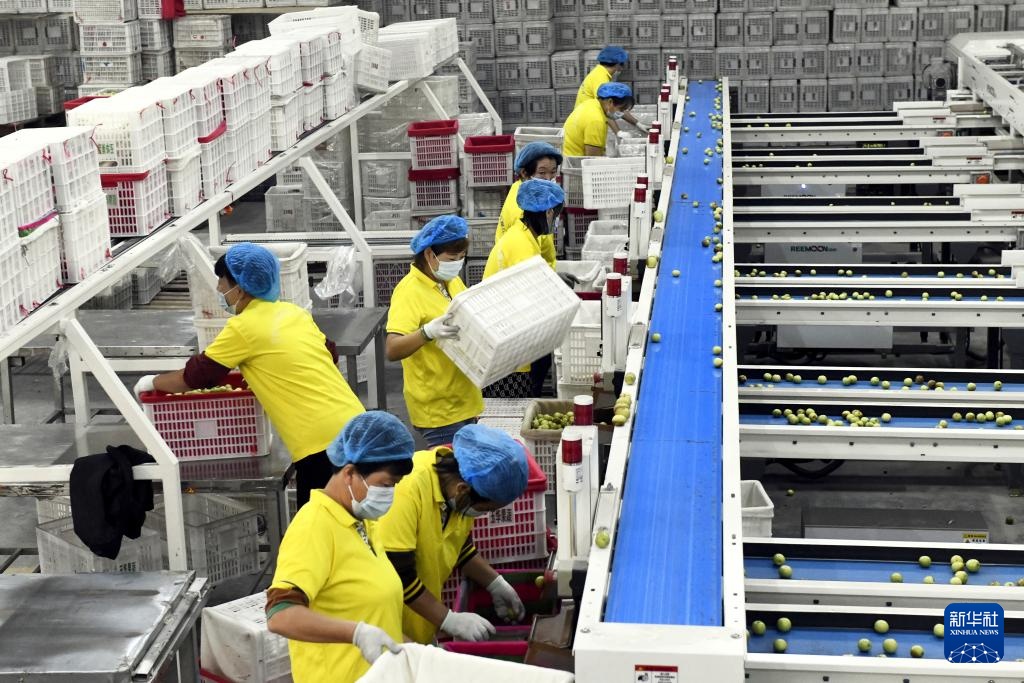 9月28日,山东省滨州市沾化区大高镇玉华果蔬有限公司车间内,工人在分拣即将出口的冬枣。