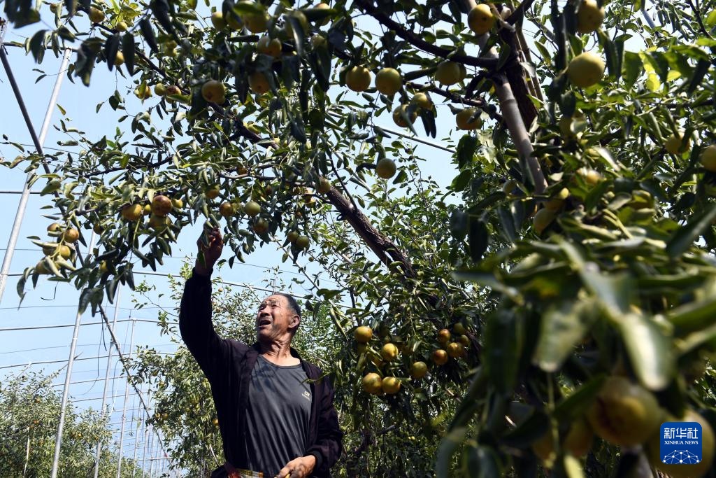9月28日,山东省滨州市沾化区大高镇冬枣园内,枣农在采摘冬枣。