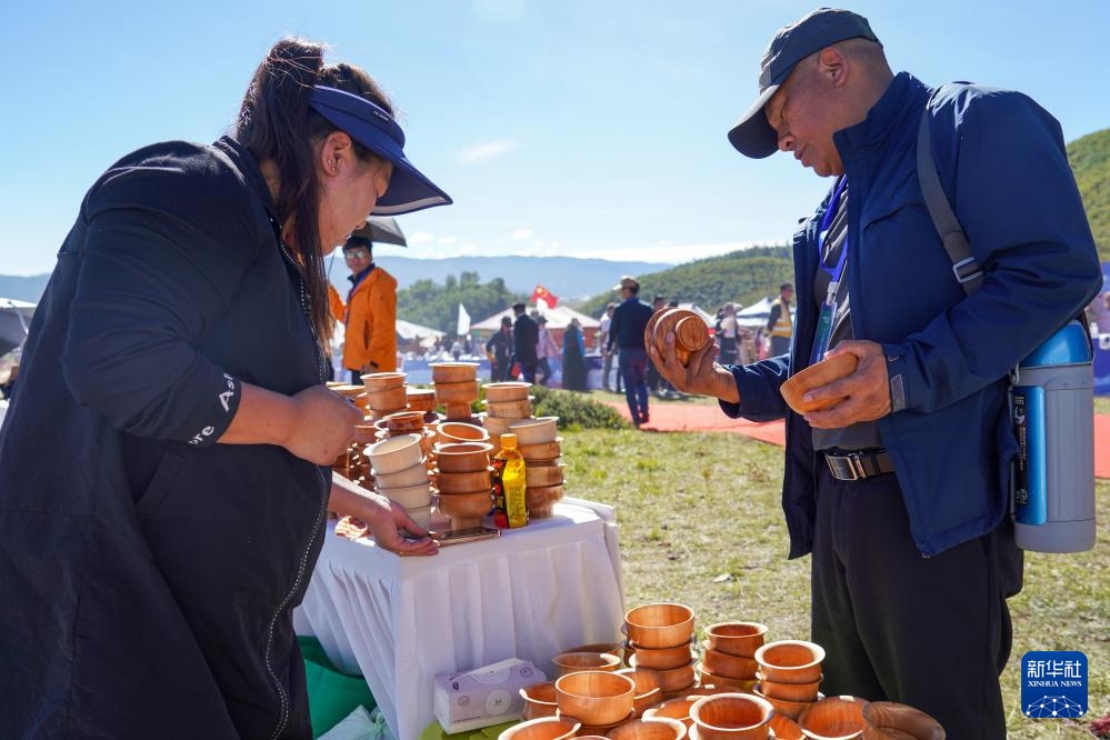 9月29日,游客(右)在文化集市上选购木碗。