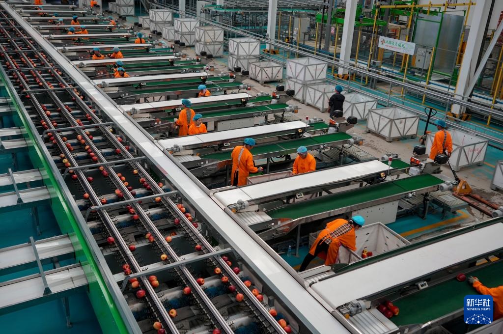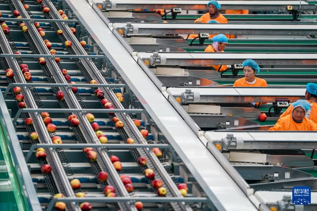 9月29日,工作人员在昭通市超越苹果基地苹果分选线上工作。