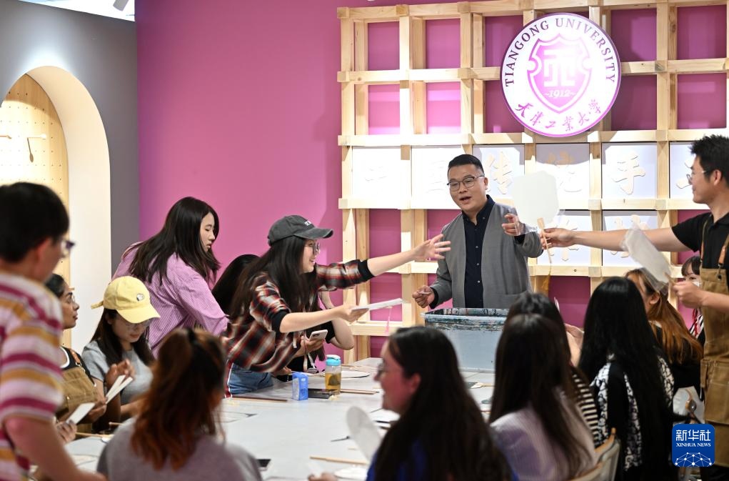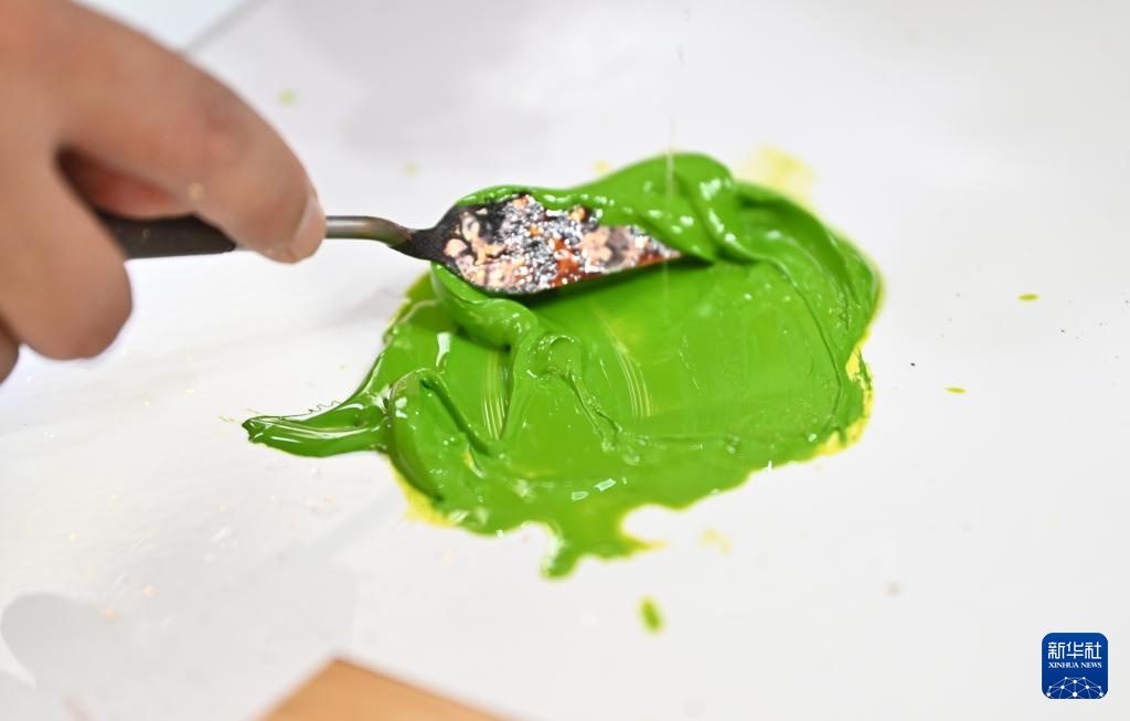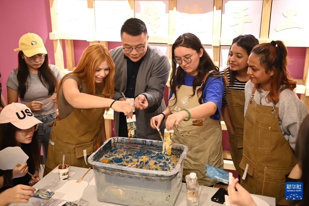 9月28日,郑勇(中)在课堂上指导中外学生体验漂流漆技法。