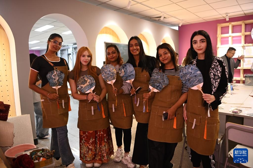9月28日,外国留学生在课堂上展示漂流漆团扇作品。