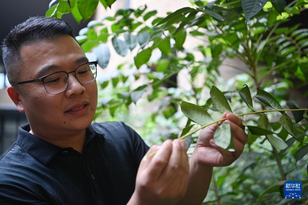 9月25日,郑勇在天津工大的校园内查看自己种植的漆树。