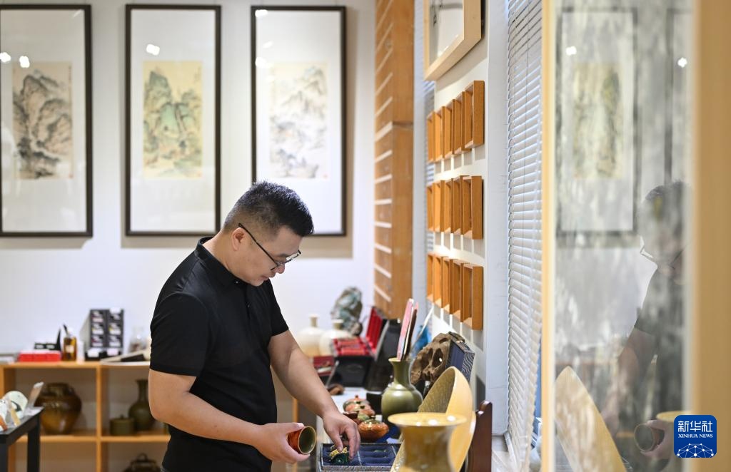 9月29日,郑勇在工作室内端详一款陶胎漆器作品。