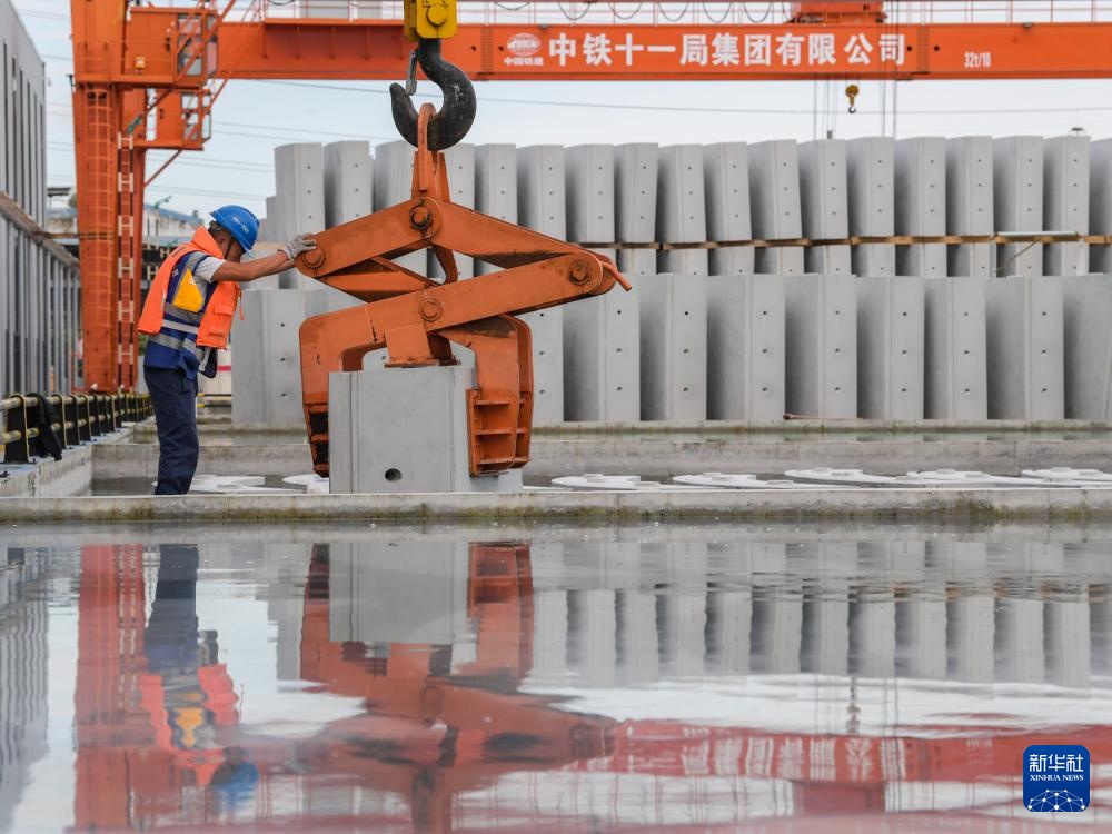 9月30日,在成渝中线高铁青白江管片厂,中铁十一局的工人在辅助管片吊入水养池。