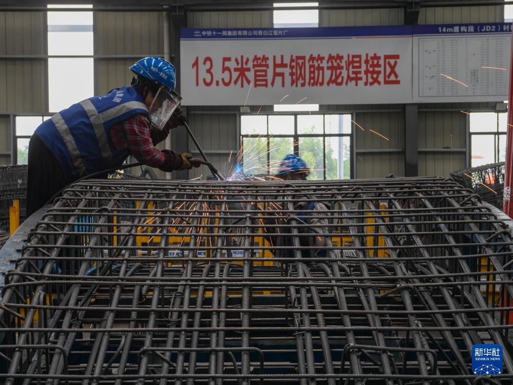 9月30日,在成渝中线高铁青白江管片厂,中铁十一局的工人在焊接管片钢筋笼。