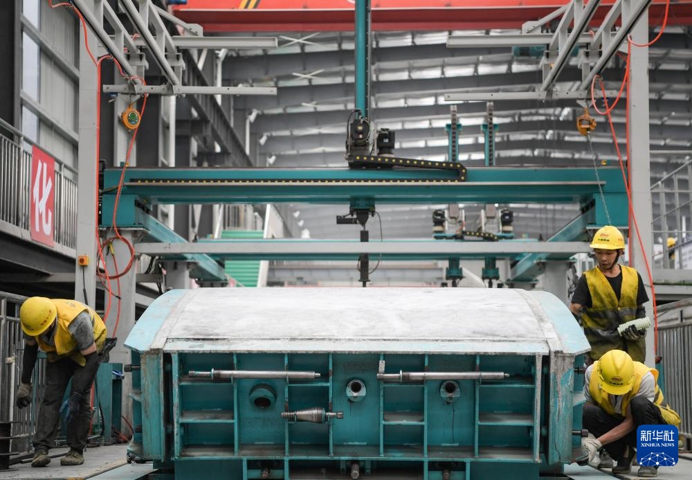 9月30日,在成渝中线高铁青白江管片厂,中铁十一局的工人在进行管片脱模。
