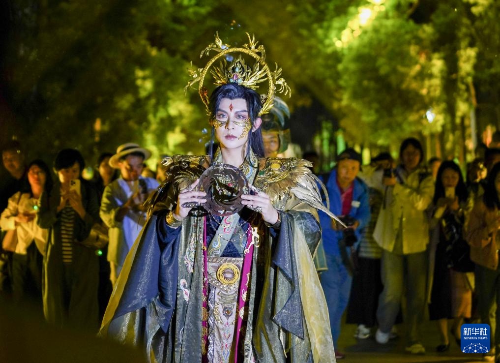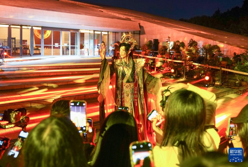 9月30日,在金沙遗址博物馆,演员在“夜游金沙·穿越古蜀——博物馆情景式导览演出秀”中表演。