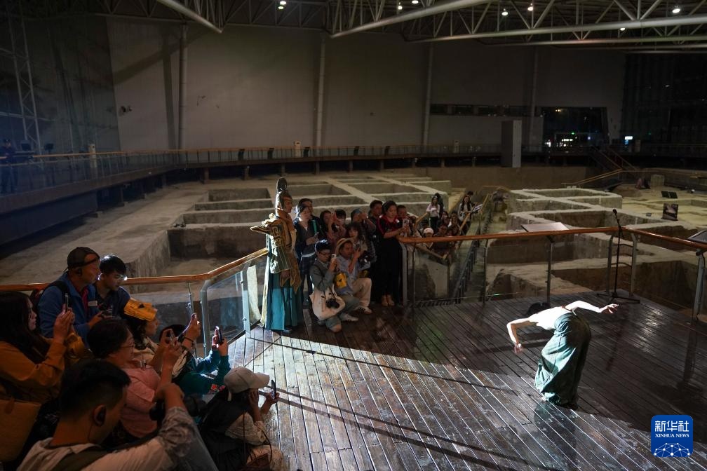 9月30日,在金沙遗址博物馆遗迹馆,观众观看演员演出。