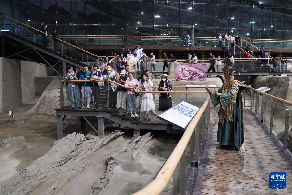 9月30日,在金沙遗址博物馆,观众观看“夜游金沙·穿越古蜀——博物馆情景式导览演出秀”。