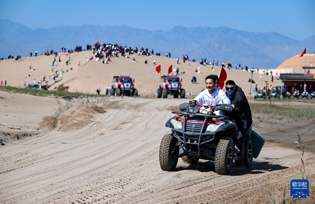 10月2日,游客在沙湖景区体验沙漠越野车。