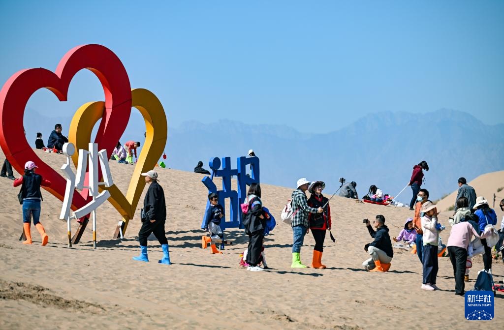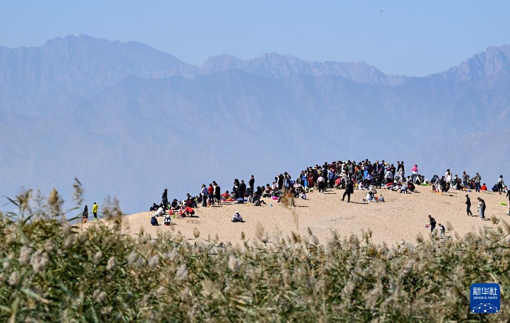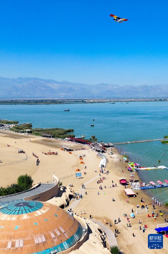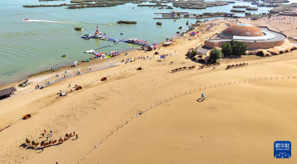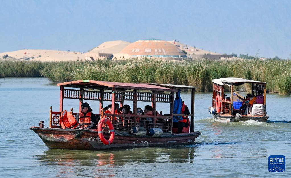 当日是国庆假期的第二天,许多游客来到宁夏石嘴山市沙湖景区,感受沙漠与湖泊相依的独特景观。