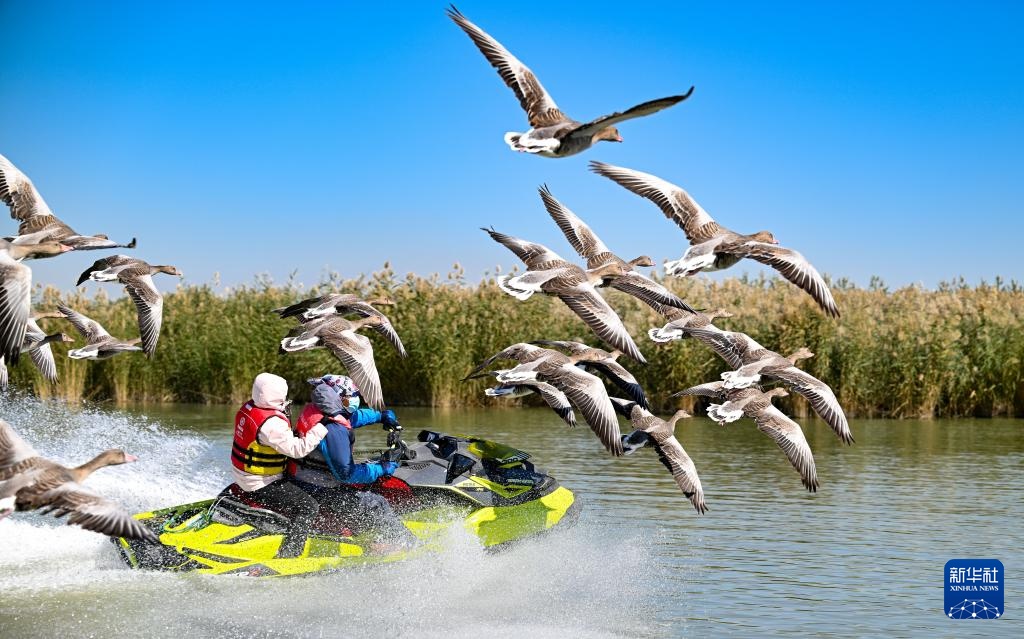 10月2日,游客在沙湖景区乘坐快艇时大雁在一旁飞翔。