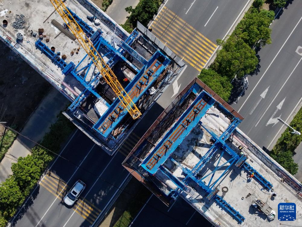 10月2日,中铁十一局的工作人员在沪渝蓉高铁泰州段通泰扬特大桥跨229省道连续梁施工现场作业(无人机照片)。
