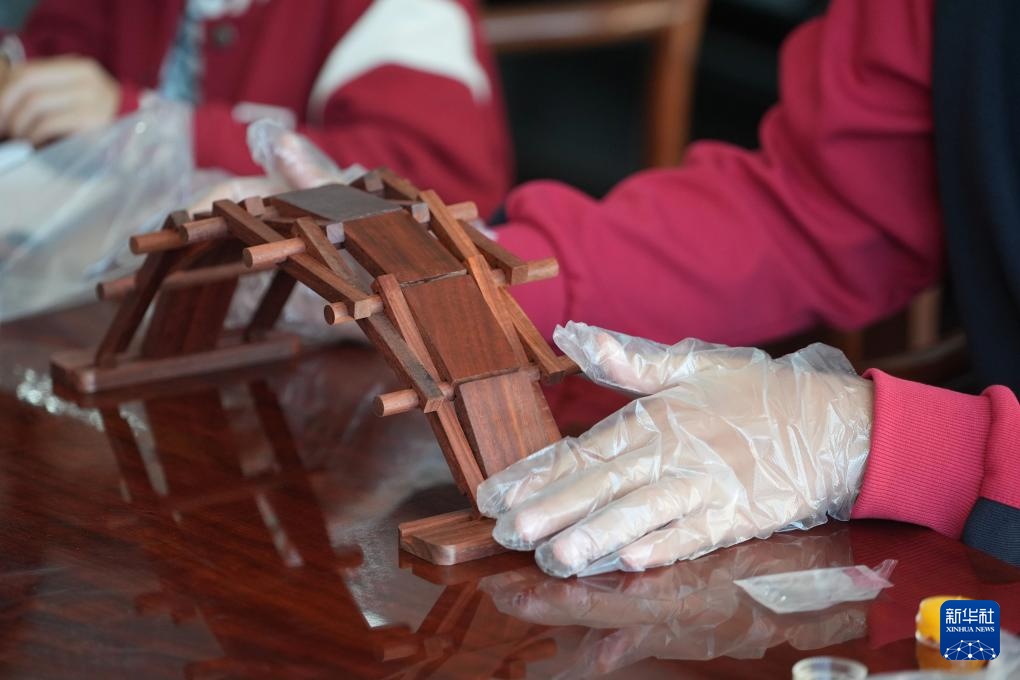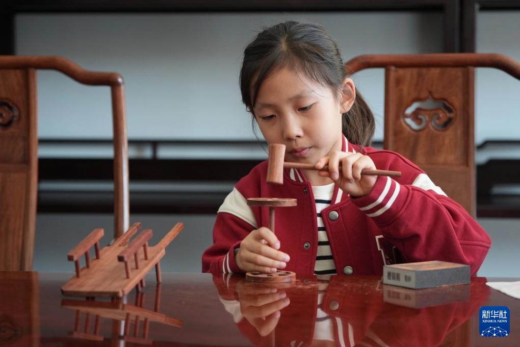 10月2日,小朋友在河北省大城县檀锦阁红木文化创新基地拼装榫卯鲁班桥。