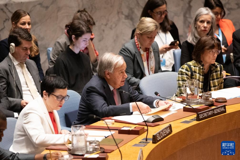 10月2日,在位于纽约的联合国总部,联合国秘书长古特雷斯(前排中)在安理会中东局势紧急会议上讲话。