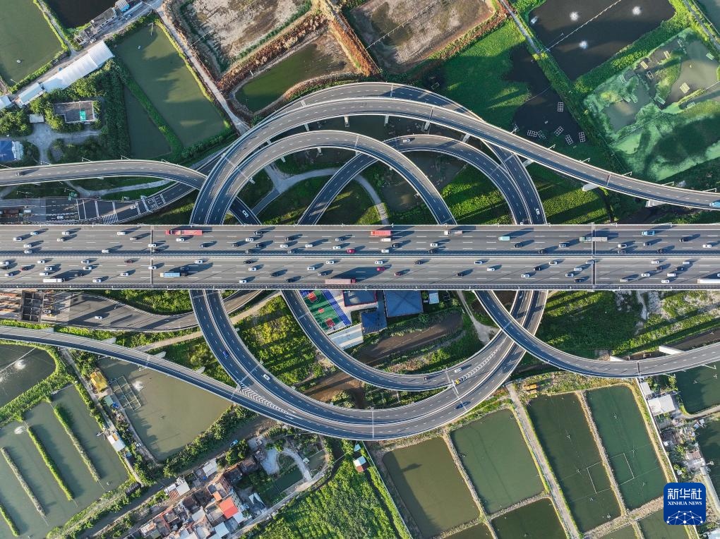 南沙大桥海鸥岛互通立交上车流穿梭(无人机照片,10月2日摄)。