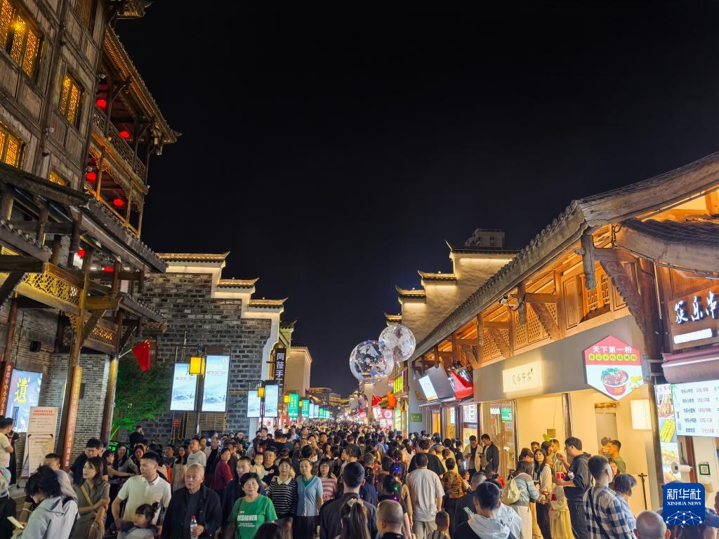 10月2日,湖南常德河街鸳鸯走马楼前人潮涌动。