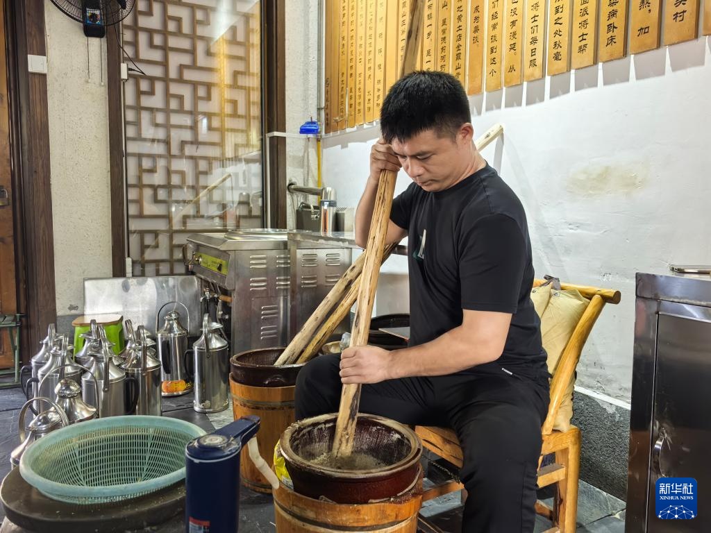 10月2日,在湖南常德河街,擂茶馆店长伍克祥正在制作擂茶。