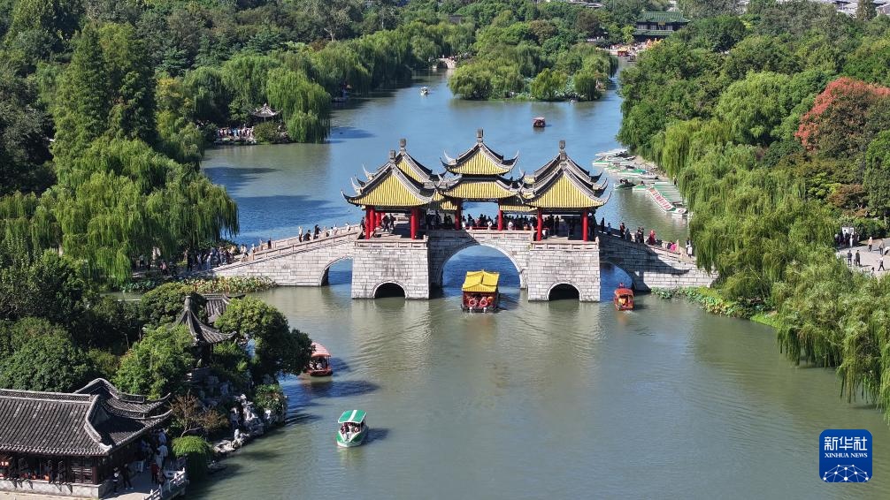 10月4日,游客乘坐游船在江苏扬州瘦西湖风景区游玩(无人机照片)。