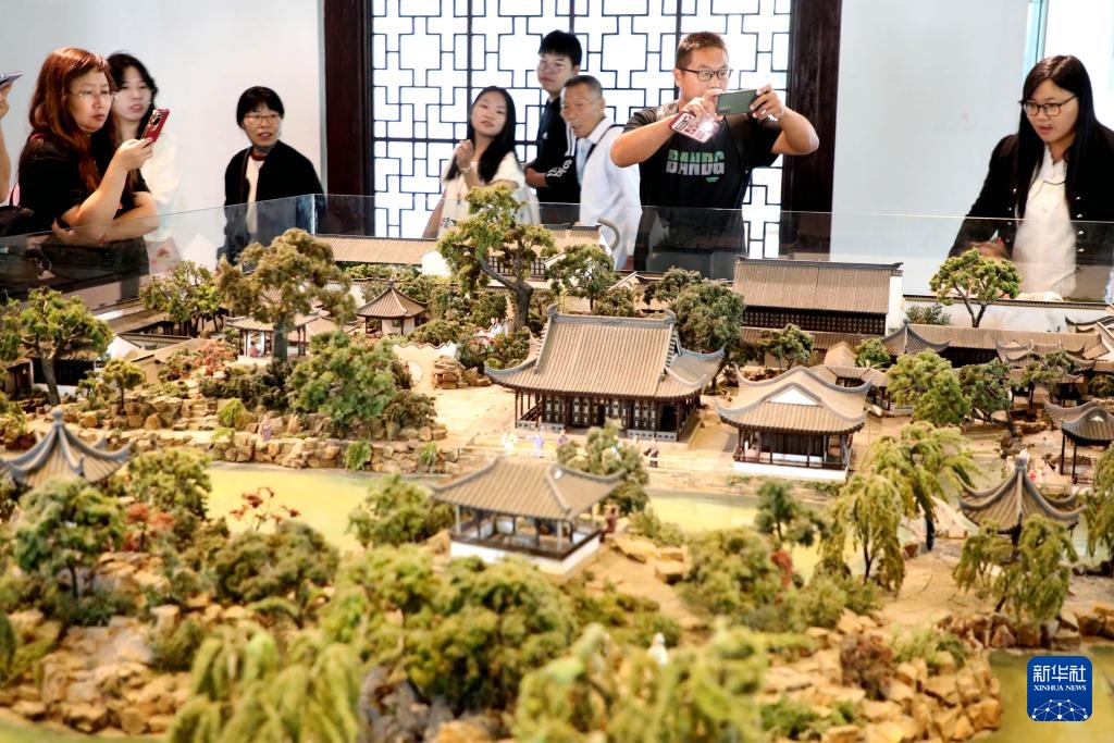 10月4日,游客在江苏苏州园林博物馆参观拙政园模型。