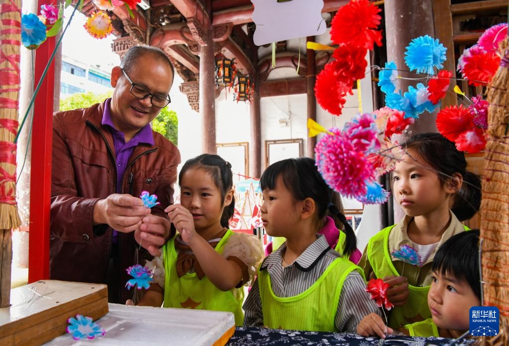 10月4日,在浙江省金华府城隍庙,小朋友观赏手工艺人制作纸花。
