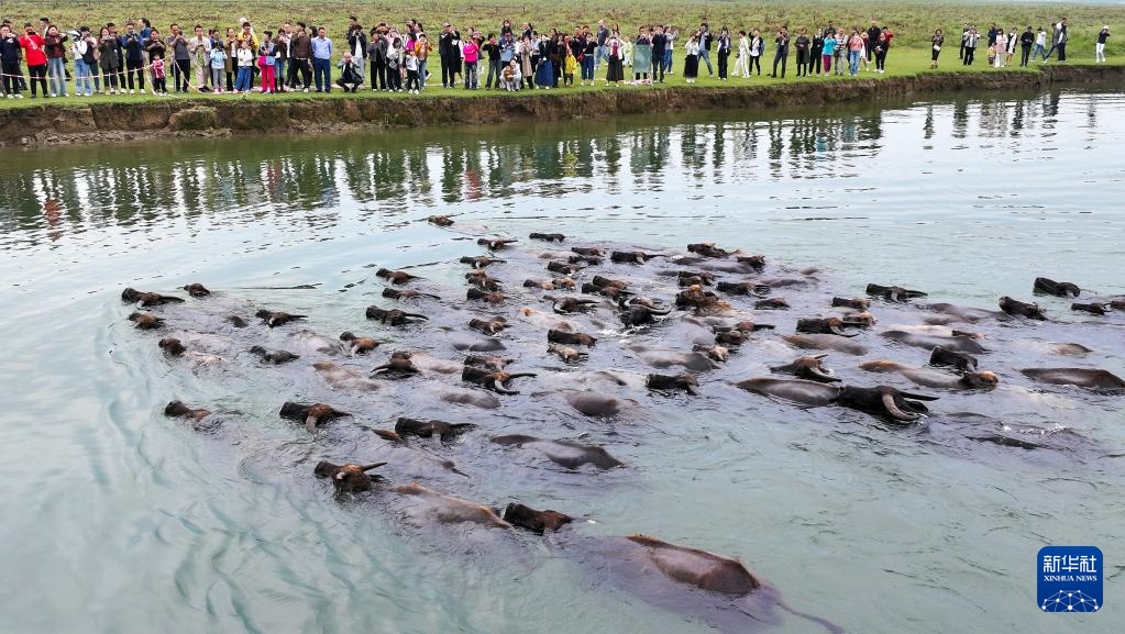 10月4日,游客在四川省南充市蓬安县相如街道观赏“百牛渡江”景观(无人机照片)。