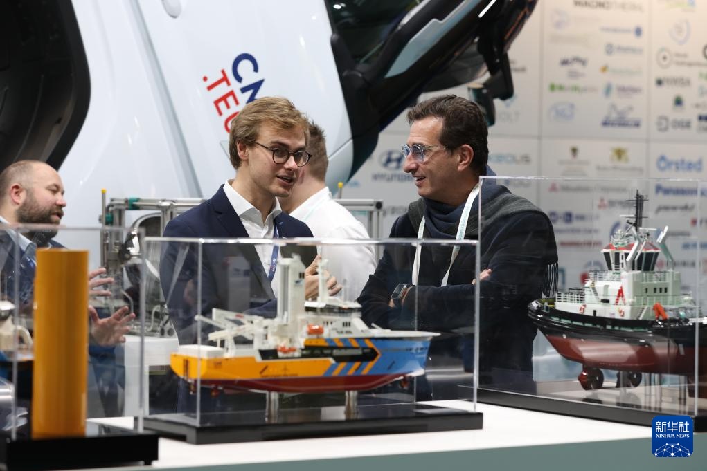 11月18日,人们在比利时布鲁塞尔的欧洲氢能周展会现场交谈。