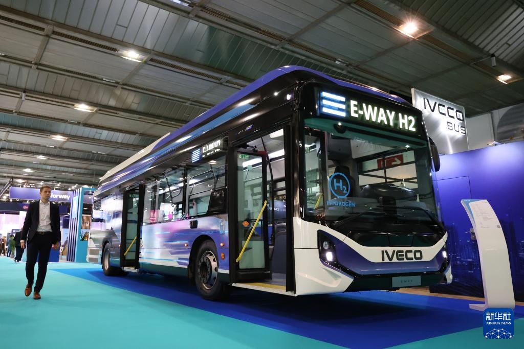 这是11月18日在比利时布鲁塞尔的欧洲氢能周展会现场拍摄的氢能大巴。