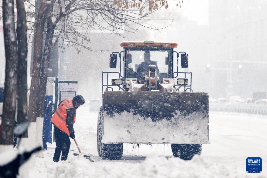 11月26日,清雪车辆在富锦市街道上开展清雪作业。