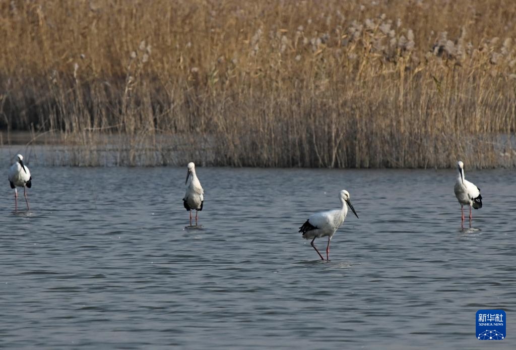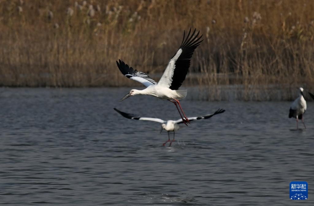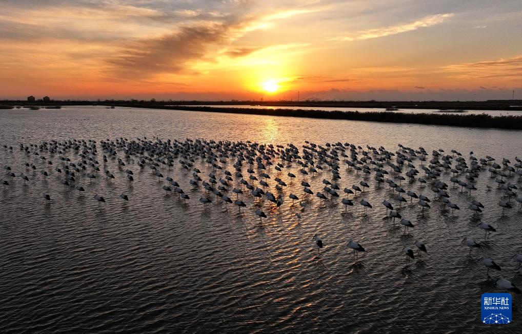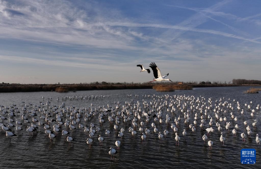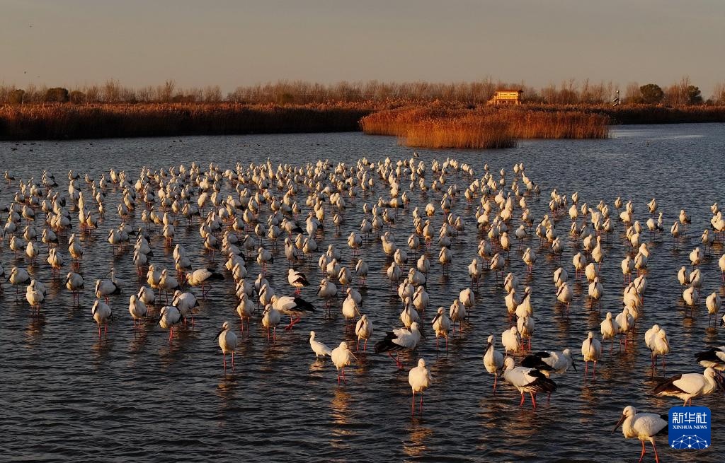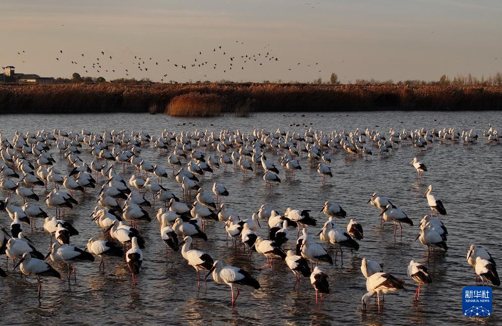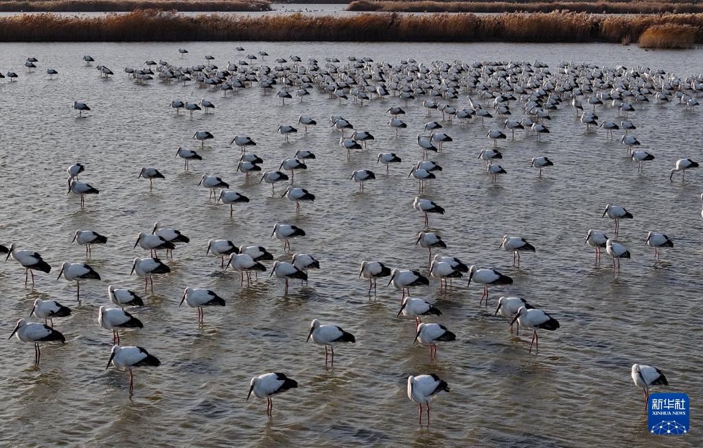 近日,大批东方白鹳飞抵河北省唐山市曹妃甸湿地休憩觅食。东方白鹳是国家一级保护动物,有“鸟类大熊猫”之称。近年来,唐山市持续加大曹妃甸湿地生态保护和修复,鸟类栖息环境得到明显改善,吸引大量迁徙的东方白鹳等鸟类在此停歇觅食。