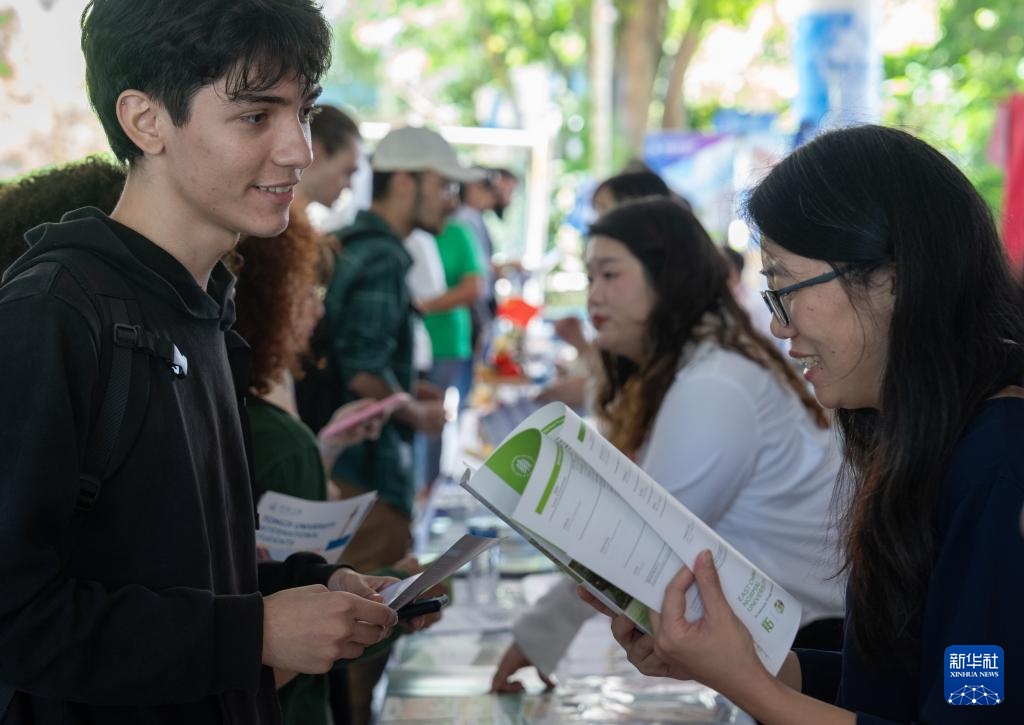 11月25日,在巴西里约热内卢联邦大学举行的中国高等教育展上,一名参观者与一名宣介人员(右)交流。