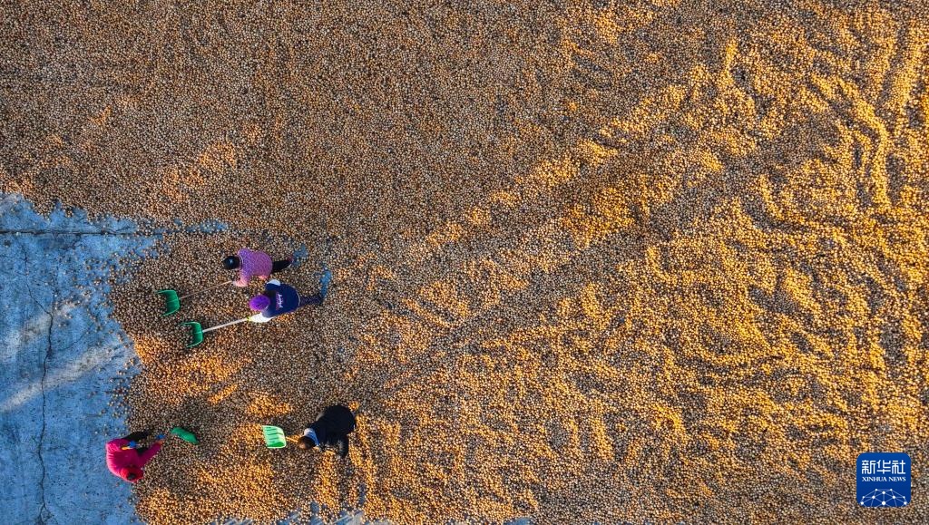 11月27日,农民在遵化市一家核桃种植专业合作社场院晾晒核桃(无人机照片)。