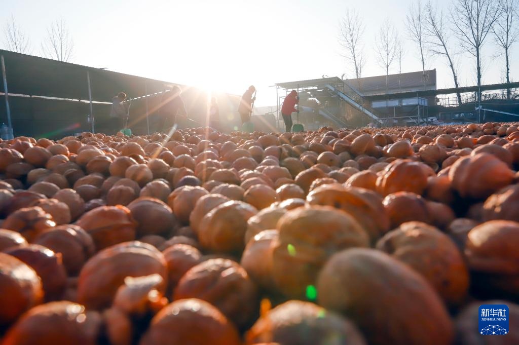 11月27日,农民在遵化市一家核桃种植专业合作社场院晾晒核桃。